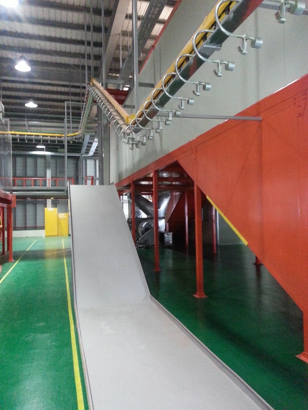 防塵帶置於軌道口下方,其目的是為了防止輸送過程中油污及雜質滴落,造成被塗物表面污染,影響製程品質,提高製作成本。防塵帶結構由U型槽、C型桿組合而成,配合特製C型吊具,在輸送過程中更能有效、完全達到防污效果。 |